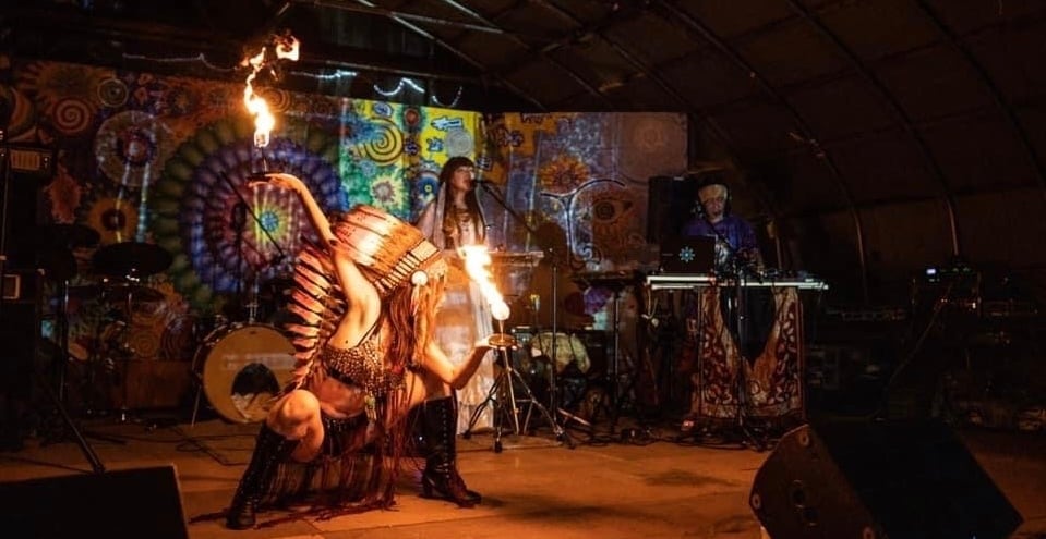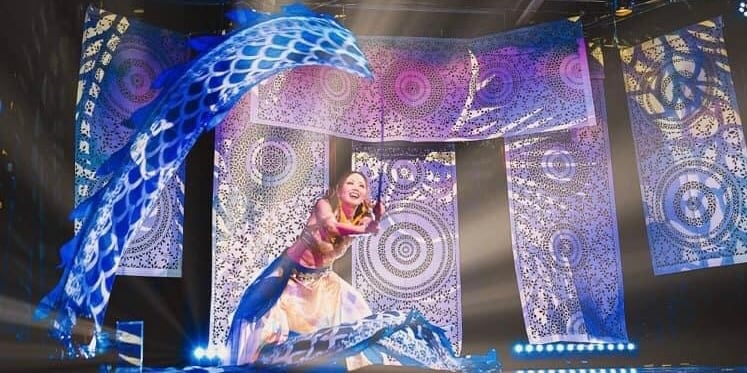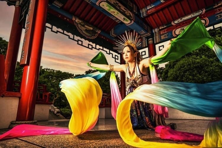 飛天舞に使用される全長12mのシルクベール。 カラフルなグラデーション染め。 持ち手部分には木のスティックが入っています。 大きく旋回することで、よりインパクトのあるパフォーマンスに。