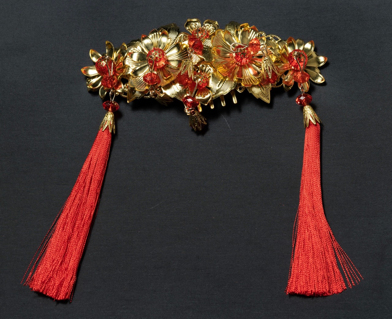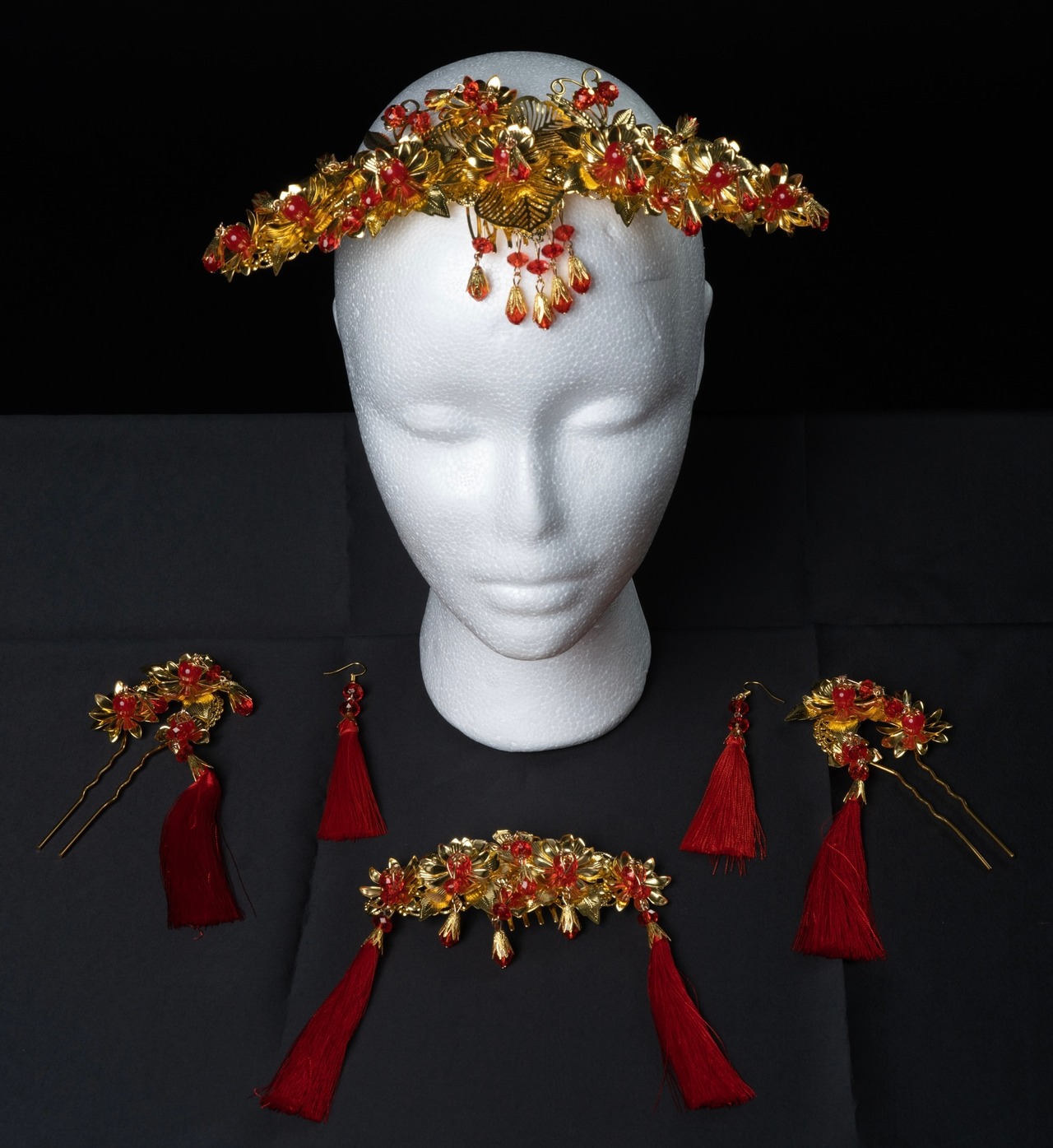 冠・コーム型髪飾り・かんざし・ピアスがセットになった中華風髪飾り。ステージ、イベント、撮影用のアクセサリーとして。
